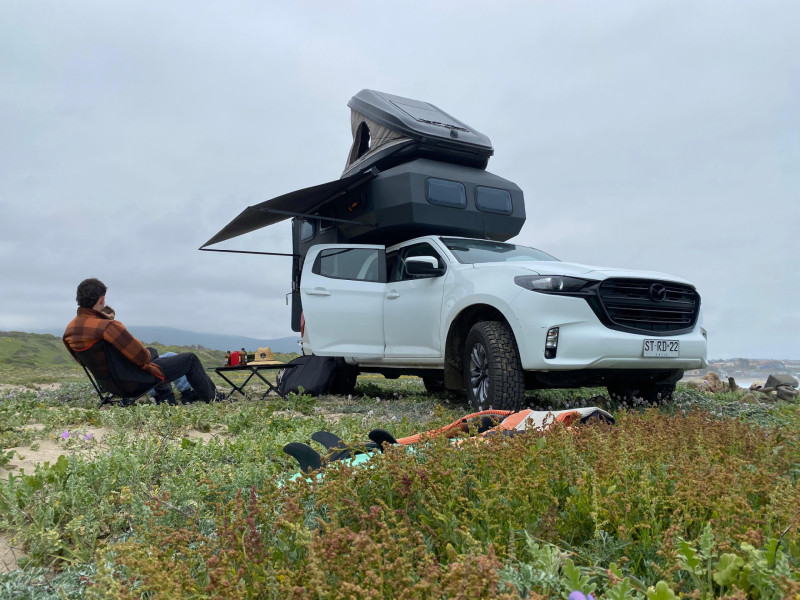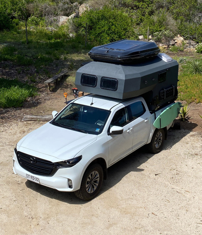 Le Gladiator Gray est un véhicule d’aventure haut de gamme basé sur un Mazda BT-50 4×4 double cabine. Puissant et fiable grâce à son moteur diesel de 3,0 L développant 188 ch et sa transmission automatique, il allie confort et robustesse pour les voyages tout-terrain. Sa particularité réside dans sa cellule monocoque intégrée, ignifugée et parfaitement isolée, transformant le pick-up en véritable mini-maison sur roues. L’intérieur de la cellule comprend un grand lit double, un coin repas modulable, une salle de bain fermée avec douche et toilettes portables, ainsi qu’une cuisine équipée avec réfrigérateur, cuisinière, évier et rangements. L’ensemble est complété par un système de chauffage au diesel, un panneau solaire, une batterie auxiliaire et des réservoirs d’eau propre et d’eaux usées, offrant une autonomie complète pour voyager hors des sentiers battus.
