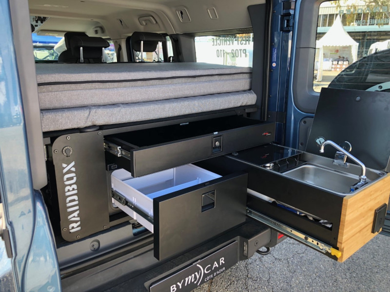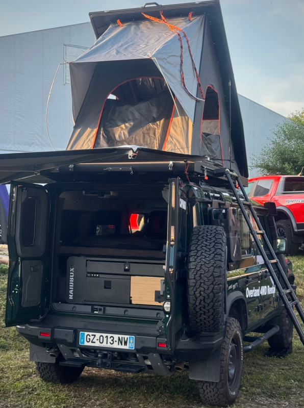 Pensé pour l’autonomie, il peut accueillir jusqu’à 5 personnes et propose 4 couchages grâce à un lit double intérieur et une tente de toit avec auvent 270°. L’aménagement RaidBox 2.0 intègre une cuisine complète (réchaud, réfrigérateur 30 L, évier), une réserve d’eau de 30 L, une douche extérieure et une batterie auxiliaire, pour profiter pleinement du bivouac en toute liberté.