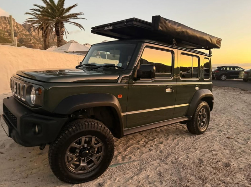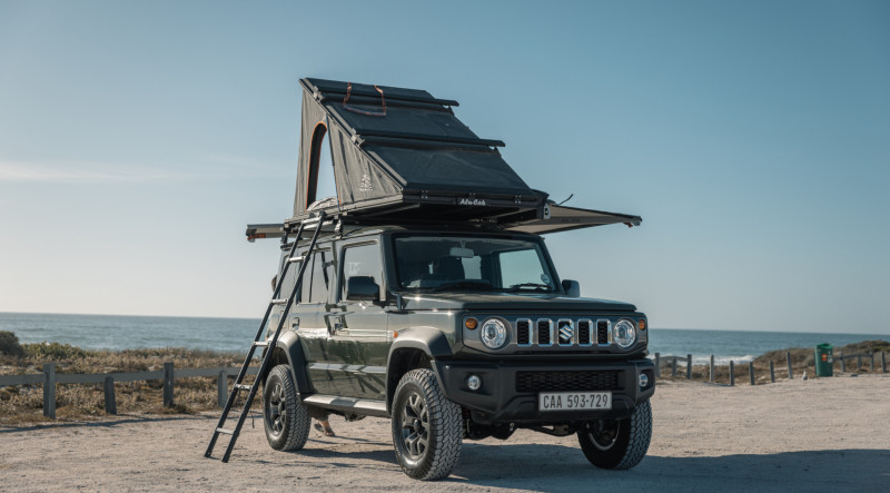 Le Jimny Olive est un petit 4×4 tout-terrain aménagé pour accueillir 2 personnes dans une configuration « camping + aventure ».