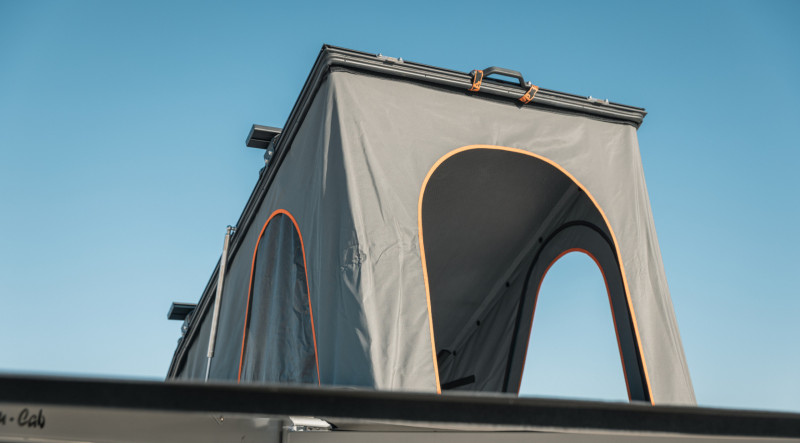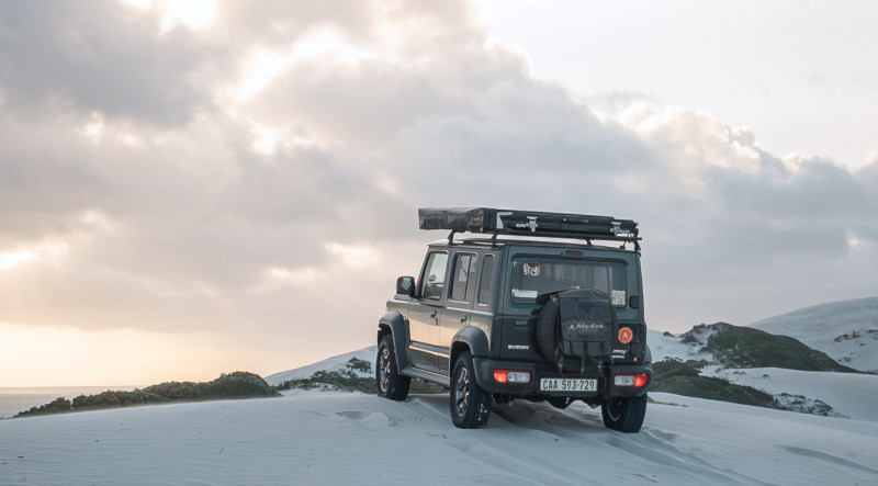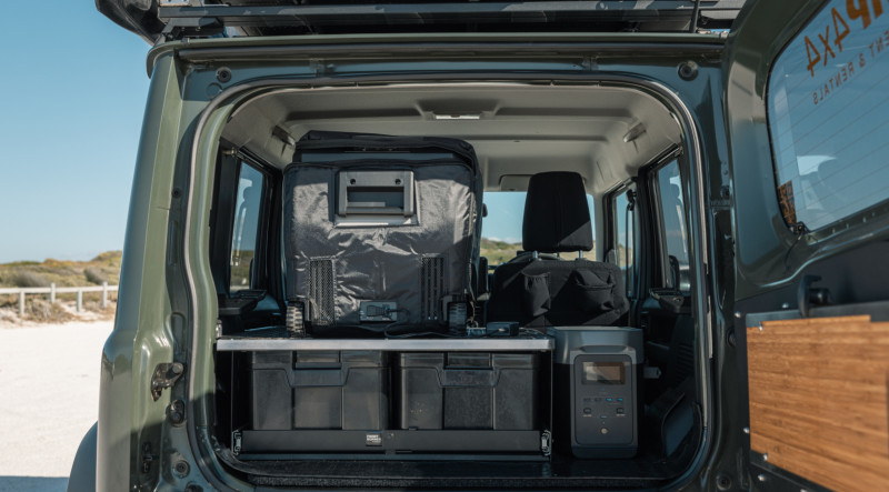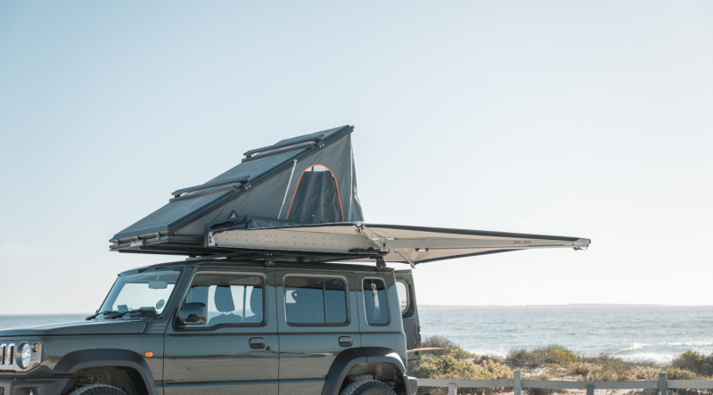 Le Jimny Tay est un petit 4×4 tout-terrain aménagé pour accueillir 2 personnes dans une configuration « camping + aventure ». Totalement équipé pour le camping : une tente de toit avec literie, une cuisine entièrement équipée, un auvent 270° de type Alu-Cab pour s’abriter, une table et deux chaises de camp, un réservoir d’eau de 50 L, un réchaud à gaz, des toiles de sol (ground sheets), du matériel de secours (recovery gear), une trousse de premiers secours et une roue de secours.