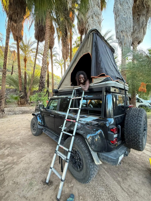 Taillé pour l’aventure et les terrains exigeants, ce Ford Bronco Raptor 4x4 combine puissance, confort et capacités tout-terrain avancées. Sa transmission automatique 4×4, associée à une suspension haute performance et un couple généreux, en fait un véhicule particulièrement à l’aise sur les pistes, les dunes ou les chemins plus techniques. L’aménagement comprend une tente de toit avec matelas (135×190 cm) permettant de dormir confortablement à deux, tandis que des tentes au sol peuvent être ajoutées pour accueillir jusqu’à quatre voyageurs au total. L’intérieur spacieux permet d’emporter facilement l’équipement nécessaire pour un road trip ou un bivouac prolongé. Le véhicule est déjà équipé pour partir à l’aventure avec housse et drap pour le matelas, deux oreillers, auvent pour créer un espace ombragé, tapis de plage pour deux personnes, glacière rigide, douche de 26 L, bande LED pour l’éclairage, pelle, kit de premiers secours, kit d’assistance routière et kit de récupération. D’autres équipements peuvent également être ajoutés selon les besoins (matériel de cuisine, table de camping, chaises, kayaks, etc.). Un choix idéal pour celles et ceux qui recherchent puissance, style et capacités tout-terrain dans un seul véhicule.