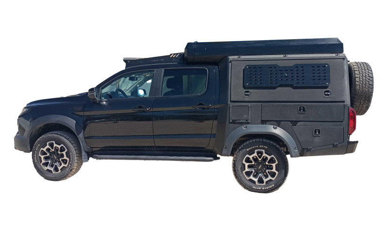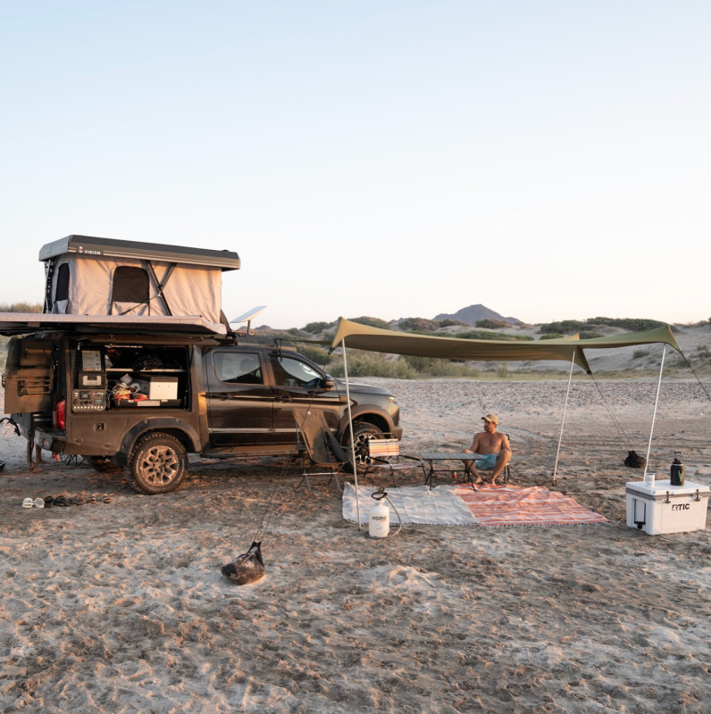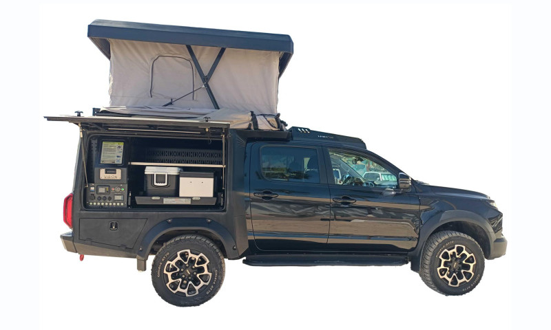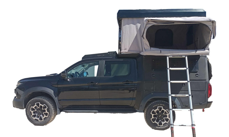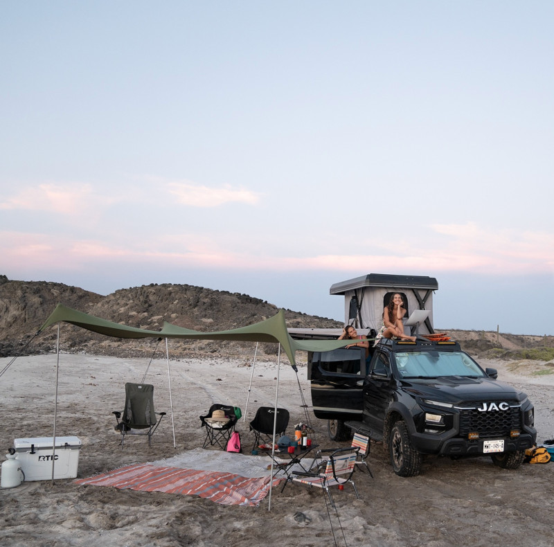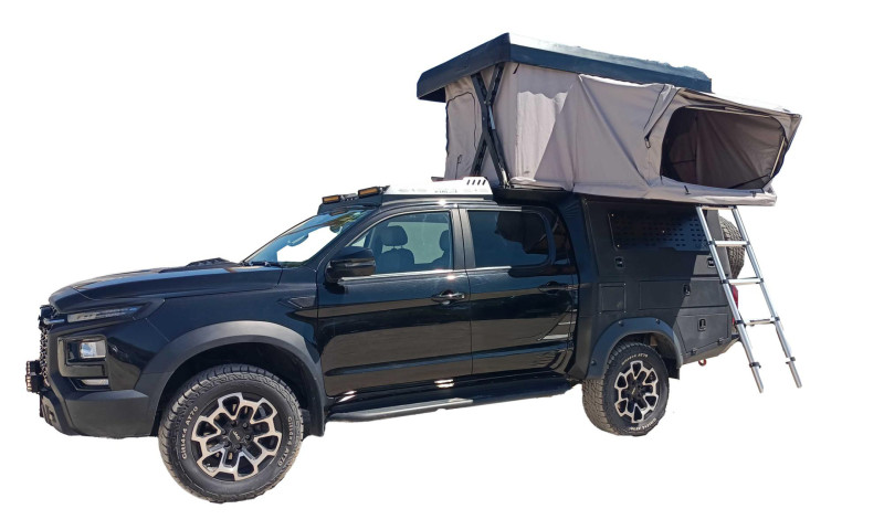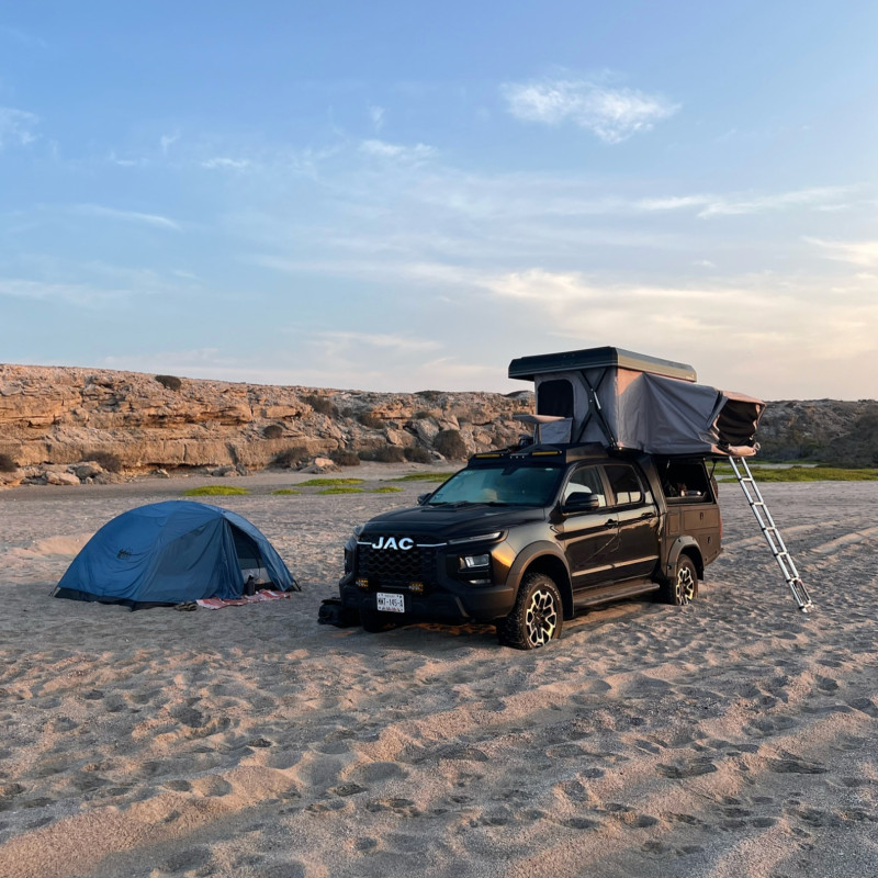 Pensé pour l’aventure et les voyages en autonomie, ce JAC Overlander 4x4 est un pick-up aménagé qui combine capacité tout-terrain et équipement complet pour le bivouac. Sa transmission automatique 4×4 permet de rouler confortablement sur route comme sur piste, tandis que sa cabine peut accueillir jusqu’à 5 personnes. Pour la nuit, le véhicule est équipé d’une tente de toit automatique avec matelas (135×190 cm) pouvant accueillir 2 adultes et 1 enfant, et des tentes supplémentaires au sol peuvent être ajoutées pour accueillir davantage de voyageurs.