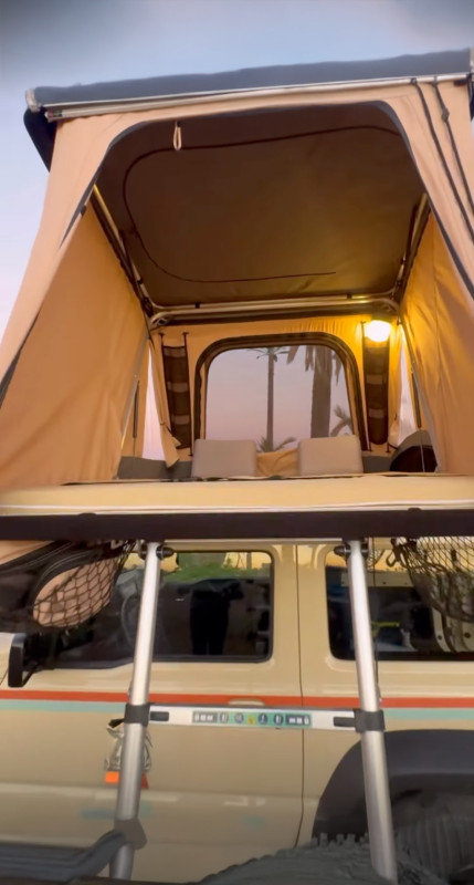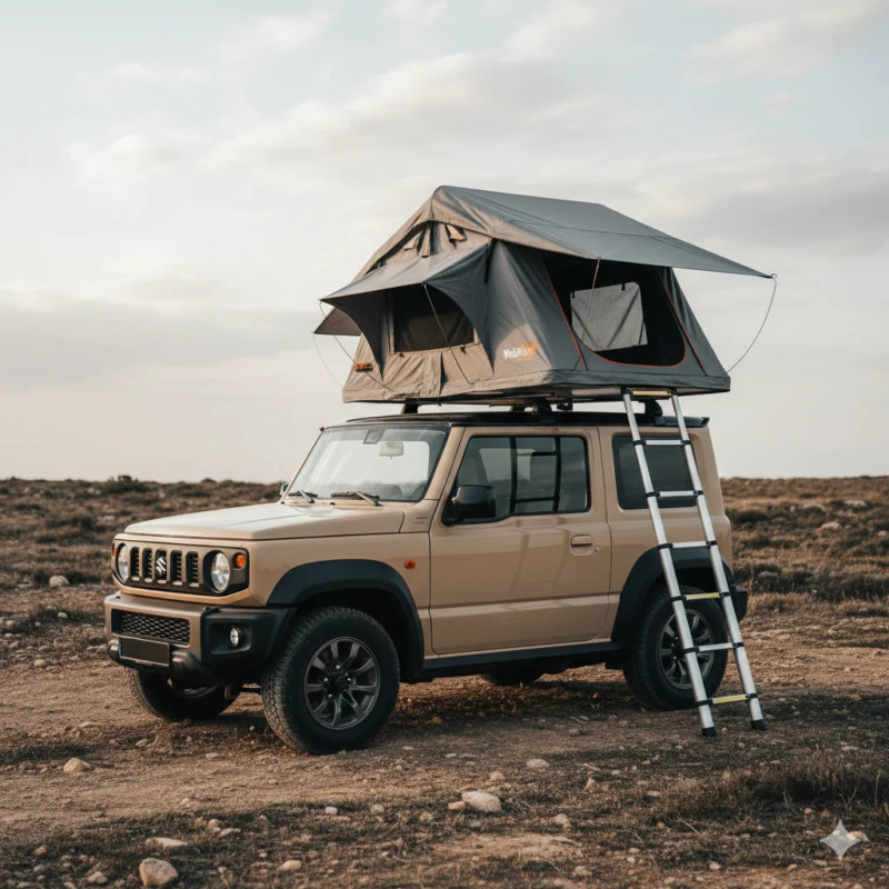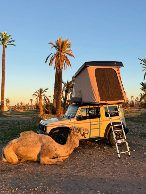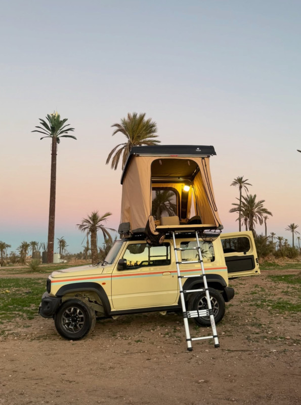 Le Suzuki Jimny Baba4×4 en version camper est un 4×4 compact conçu pour l’aventure et parfaitement adapté à l’exploration du Maroc hors des sentiers battus. Grâce à son format agile et à sa véritable transmission 4 roues motrices, il accède facilement aux pistes de montagne, aux terrains rocailleux, aux vallées isolées et aux zones désertiques souvent inaccessibles aux véhicules classiques. Cette version aménagée transforme le Jimny en un véritable compagnon de voyage autonome, équipé d’une tente de toit XL NaitUp à déploiement rapide en seulement quelques secondes, permettant de s’installer facilement où que vous soyez et de profiter pleinement de chaque étape.