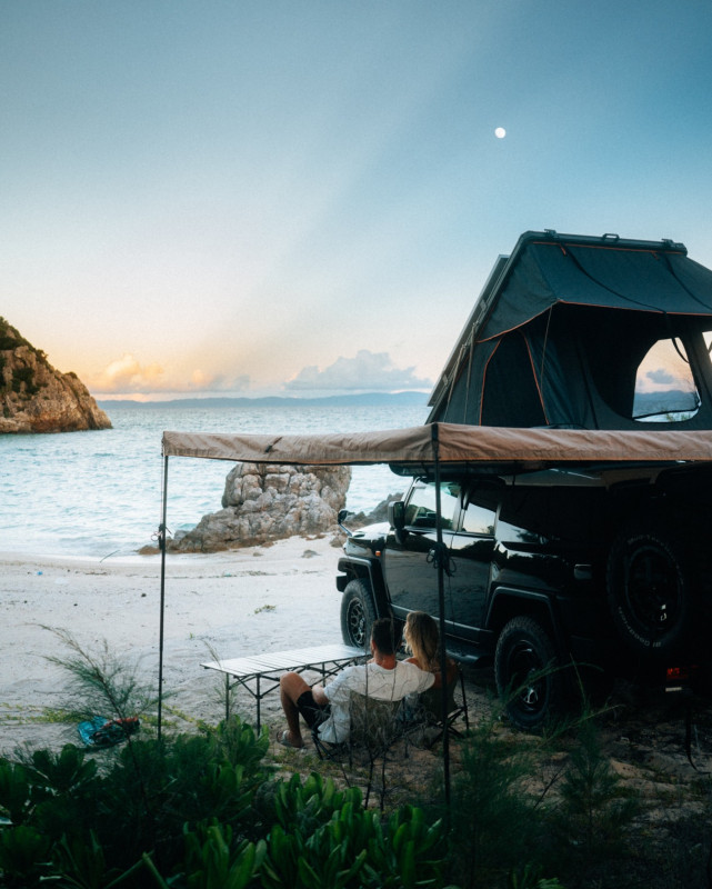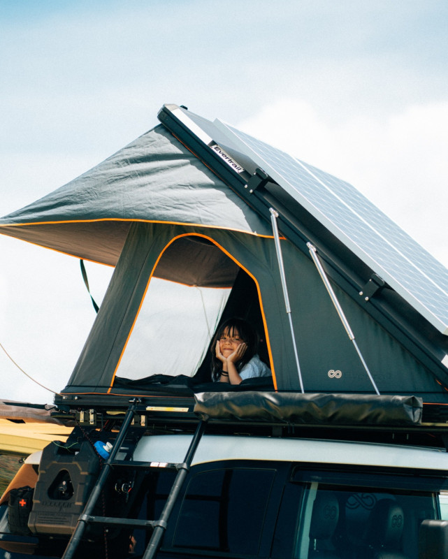 Le véhicule est équipé d’une tente de toit spacieuse, qui se déploie facilement pour dormir confortablement au-dessus du sol, à l’abri et en sécurité. Pour profiter pleinement de vos pauses en extérieur, il dispose également d’un auvent latéral qui crée une zone ombragée et protégée du vent ou de la pluie.